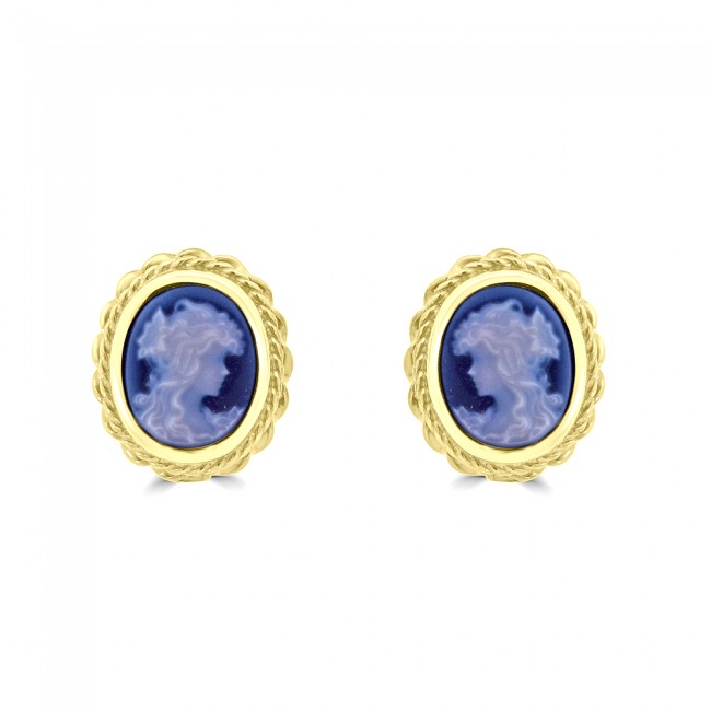 Oval Blue Agate Cameo with a rope-twist outline in yellow gold. The studs are fitted by stem and butterfly back.