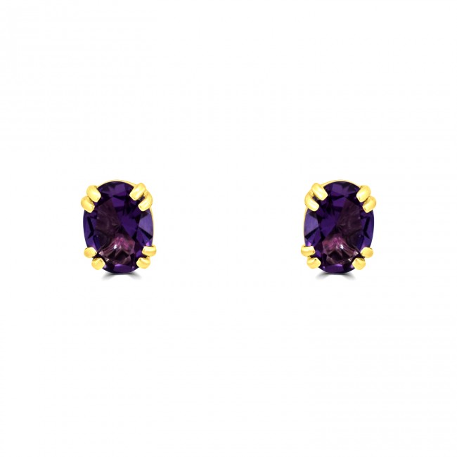 Two beautifully matching Amethysts, oval cut and measuring 8x6mm. Set in the warm tones of a yellow gold double-clawed setting, the studs are fitted by stem and butterfly back.