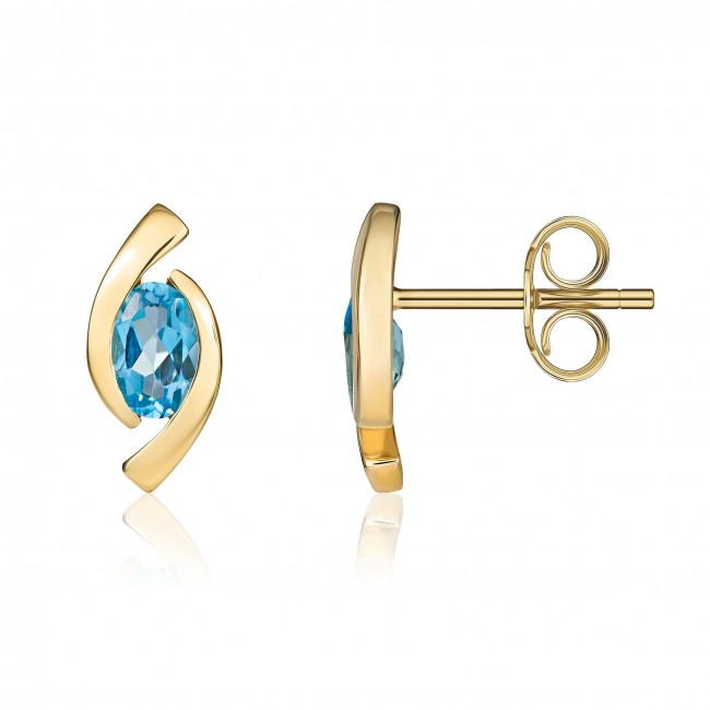 A swiss Blue Topaz radiates vibrant ice-blue tones between two curved, tapered bars that compliment with rich and warm 9ct yellow gold. The stud earrings are fitted by stem and butterfly back. Oval cut Blue Topaz measure 6x4mm