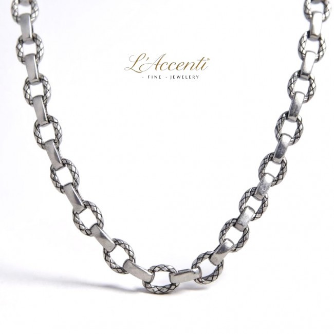 Understated, yet beautifully ornate in solid sterling silver. Measuring 20" length and fitted with an integrated bolt clasp. Designed and manufactured in Italy.