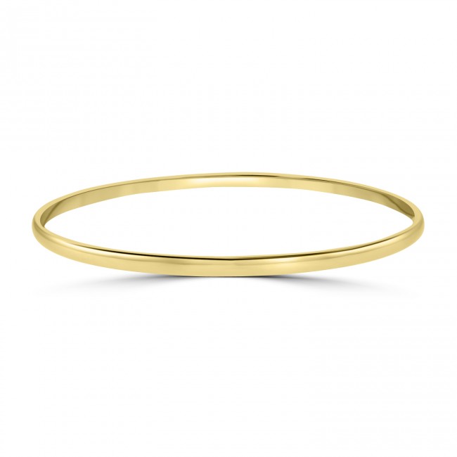 Understated in design, yet practical and rich in the tones of 9ct yellow gold. This solid bangle measures 3.5mm in width, with a rounded, D-shaped profile. The inside diameter measures 65mm.