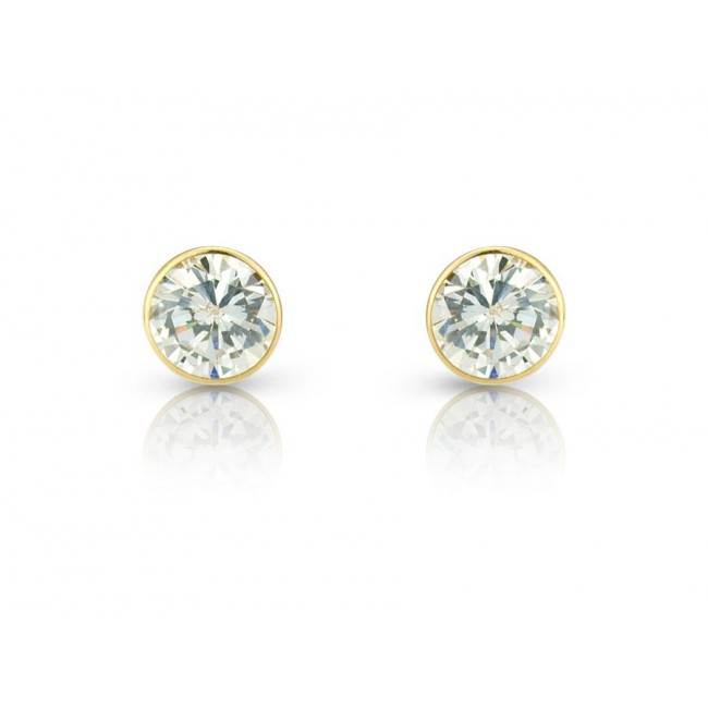 Round, brilliant cut white cubic zirconias, measuring 6mm are encased in the warm tones of 9ct yellow gold in a smooth, flush setting. The stud earrings are fitted by stem and butterfly back.