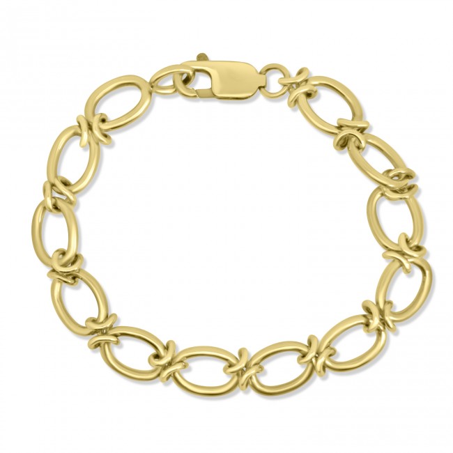 A solid, practical bracelet in a beautifully elegant design, comprised of soft, oval links with intricately shaped 'knot' elements. The bracelet measures 7.5" in the rich tones of 9ct yellow gold, fitted by a lobster catch.