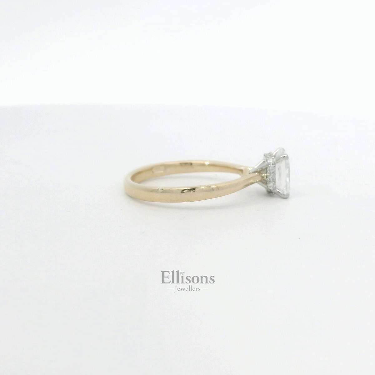This beautifully proportioned Radiant cut Diamond displays striking symmetry and dazzling brilliance from within its silky white, platinum setting. The side profile features a "hidden halo" by way of the gallery bar inset with pave diamond. The tapered shank contrasts with the warm tones of 18ct yellow gold. Radiant cut 1.00ct ~ GIA Report 7502908199 Certified E Colour ~ VS2 Clarity ~ Excellent Polish/Symmetry ~ Fluorescence None