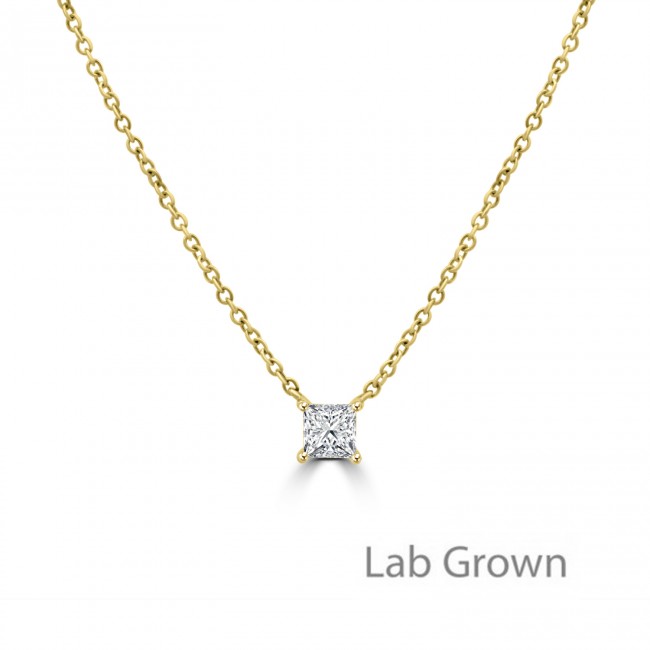 This square, princess cut Laboratory Grown Diamond is clawed in 9ct yellow gold and fitted within a 16-18" belcher chain.