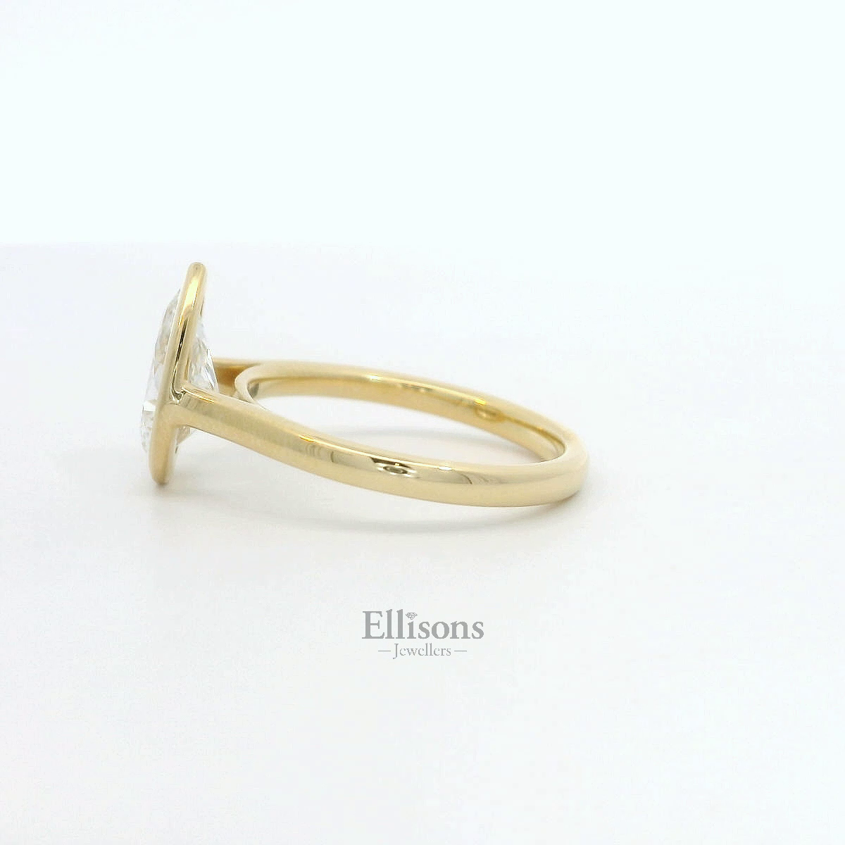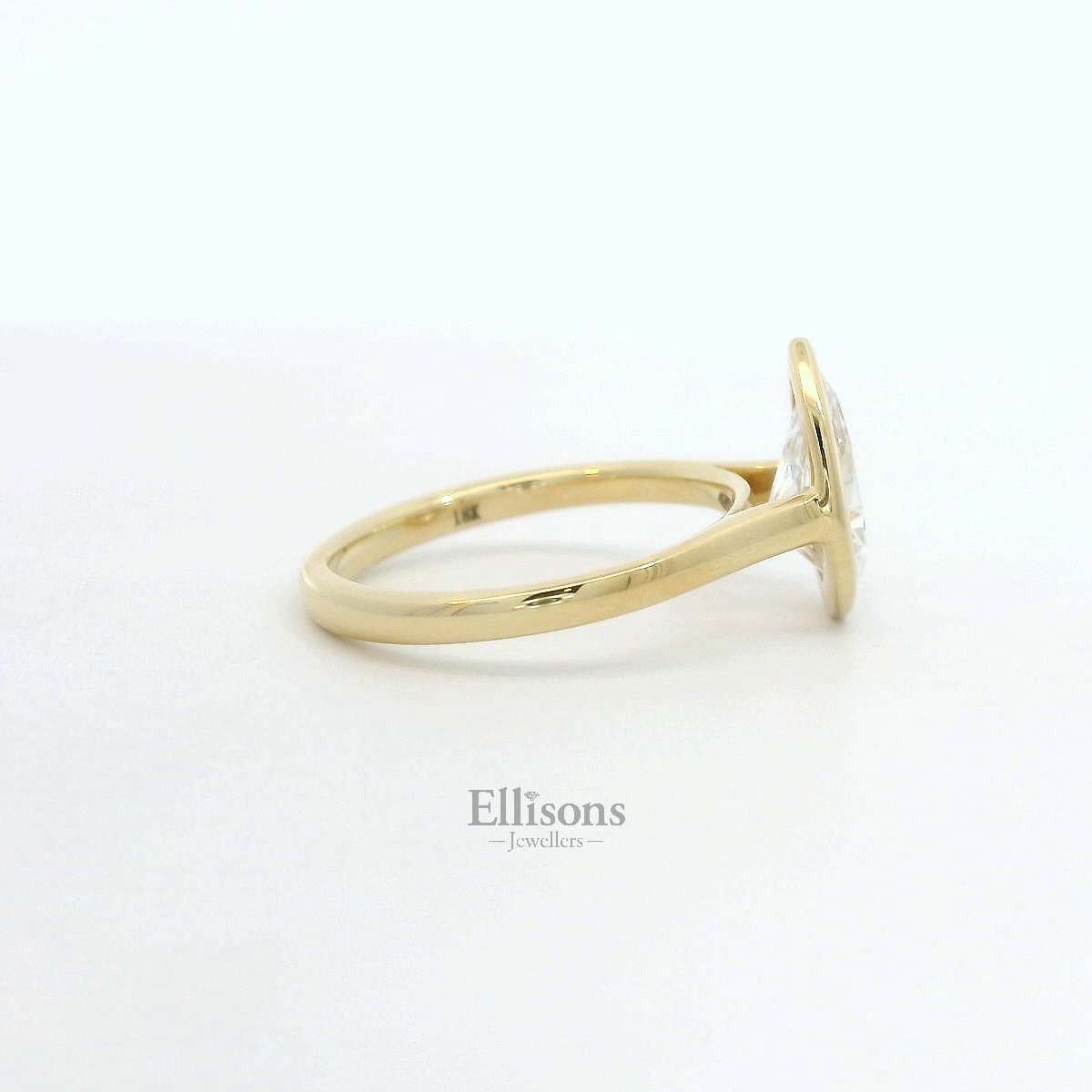 A beautifully elegant and understated setting that contrasts the white brilliance with rich tones of 18ct yellow gold. The smooth, bezel setting is made bespoke to suit the contours of this dazzing pear cut solitaire perfectly. The side profile reveals the side profile of the diamond pavillion and the mount allows for a perfect wedding ring fit, alongside its 2.2mm yellow gold shank.