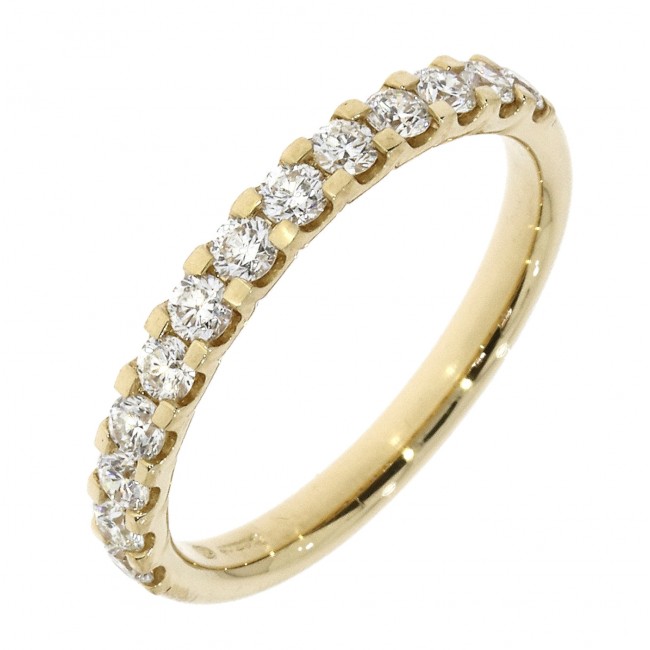 Thirteen round, brilliant cut Diamonds are set flush in a cut-out castle setting within a 2.5mm band made luxurious 18ct yellow gold. The top surface is smooth with square-shaped claw tips than blend beautifully with the encased diamond brilliance.