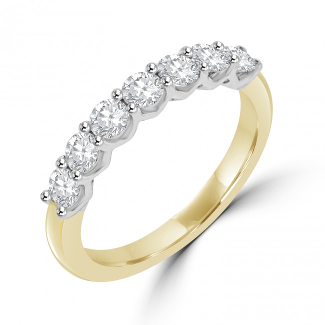 Seven brilliant cuts are beautifully hand set in a platinum shared claw with an open V-shape profile. The white diamond brilliance contrasts effectively with the warm. majestic tones of an 18ct yellow gold shank.