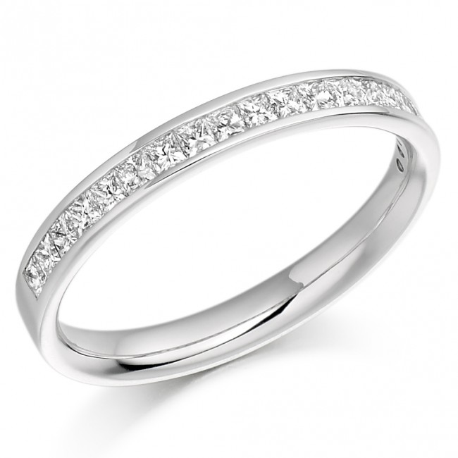 A series of princess cut diamonds form a solid array of brilliance, set flush within a smooth channel. Crafted in luxurious platinum with a court shaped centre for comfort.