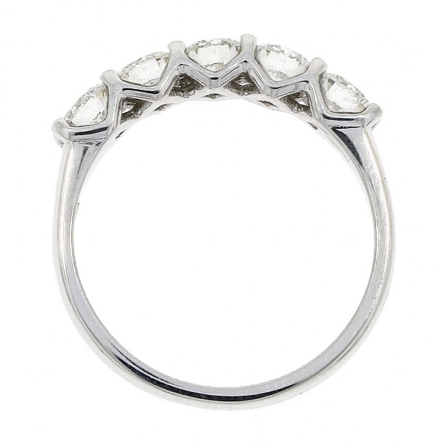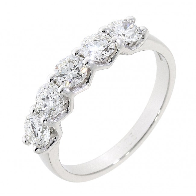 Five round, Diamonds blend seamless brilliance and refined quality from within a hand set, platinum mount. The shared claw setting is beautifully contoured with an open 'daylight' side profile.